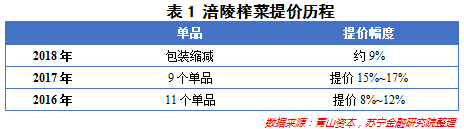 先来看备受瞩目的涪陵榨菜。早在2016年,涪陵榨菜就曾宣布对主力产品进行涨价,2017年更是一口气将9个单品提价15%~17%,到了2018年,涪陵榨菜索性以缩减包装的形式,变相提价9%(参见表1)。不过,由于榨菜产品集中度高、异质性强,定价能力也不弱,近年来,作为龙头企业的涪陵榨菜,对产品的提价并未给销量带来影响。这或许从侧面反映出居民的消费仍在升级。 dedecms.com