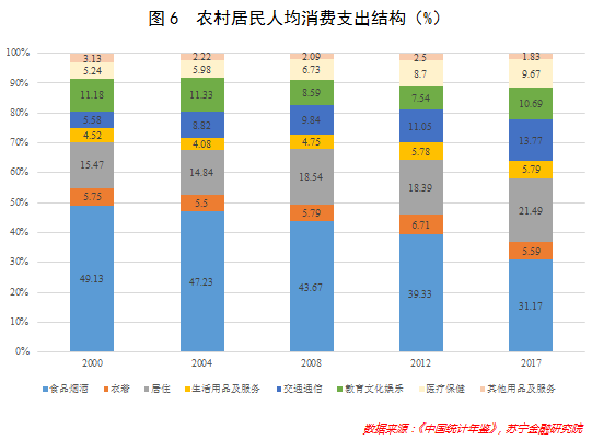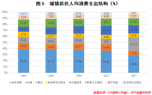Wind数据显示,进入新世纪以来,我国城镇居民与农村居民的恩格尔系数在个别年份有所波动,但大体走势是下降的。尤其是自2012年起,城乡居民的恩格尔系数下降趋势更为明显。其中,城镇居民恩格尔系数由2012年的36.23%下降至2017年的28.6%,同期的农村居民恩格尔系数则由39.33%下降至31.2%(参见图4)。