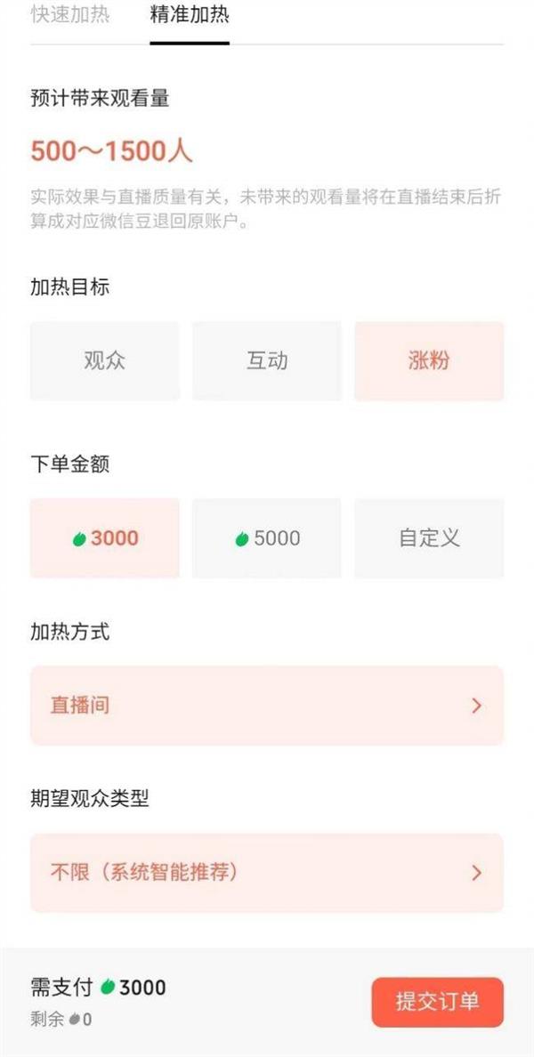 在“快速加热”功能下,不论是何种档位的下单金额,预计加热时长均为0.5小时,但未带来的观看量可以在直播结束后折算成对应微信豆退回原账户。