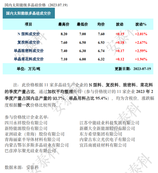 网络整理 2025-11-16 14:45证券之星光伏行业周报:中国有色金属工业协会硅业分会数据显示,本周硅料库存消化明显,多晶硅价格小幅上涨。浙商证券最新观点指出,HJT电池重大突破临近,预计2023年逐步实现盈利,2024年有望引来产业化大年。宏观方面,国家能源局数据显示,今年上半年我国可再生能源发电总装机突破13亿千瓦,其中太阳能发电装机4.71亿千瓦。企业方面,阿特斯7月19日公告显示,确定投资建设呼和浩特阿特斯电子材料科技有限公司年产20GW单晶拉棒、40GW单晶坩埚项目以及年产10GW切片+10GW电池+5GW组件+5GW新材料项目,预计投资金额分别为80亿元以及60亿元。 内容来自dedecms