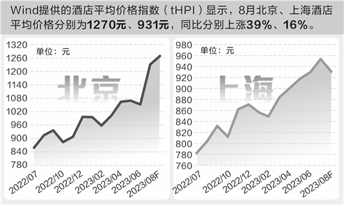 在本轮酒店涨价中,一线旅游城市“一马当先”。Wind提供的酒店平均价格指数(tHPI)显示,8月北京、上海酒店平均价格分别为1270元、931元,同比分别上涨39%、16%。