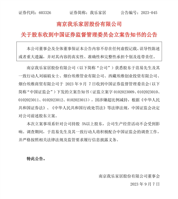 在经历8连板后,我乐家居跌停,今日午间公司发布关于股东收到中国证券监督管理委员会立案告知书的公告。
