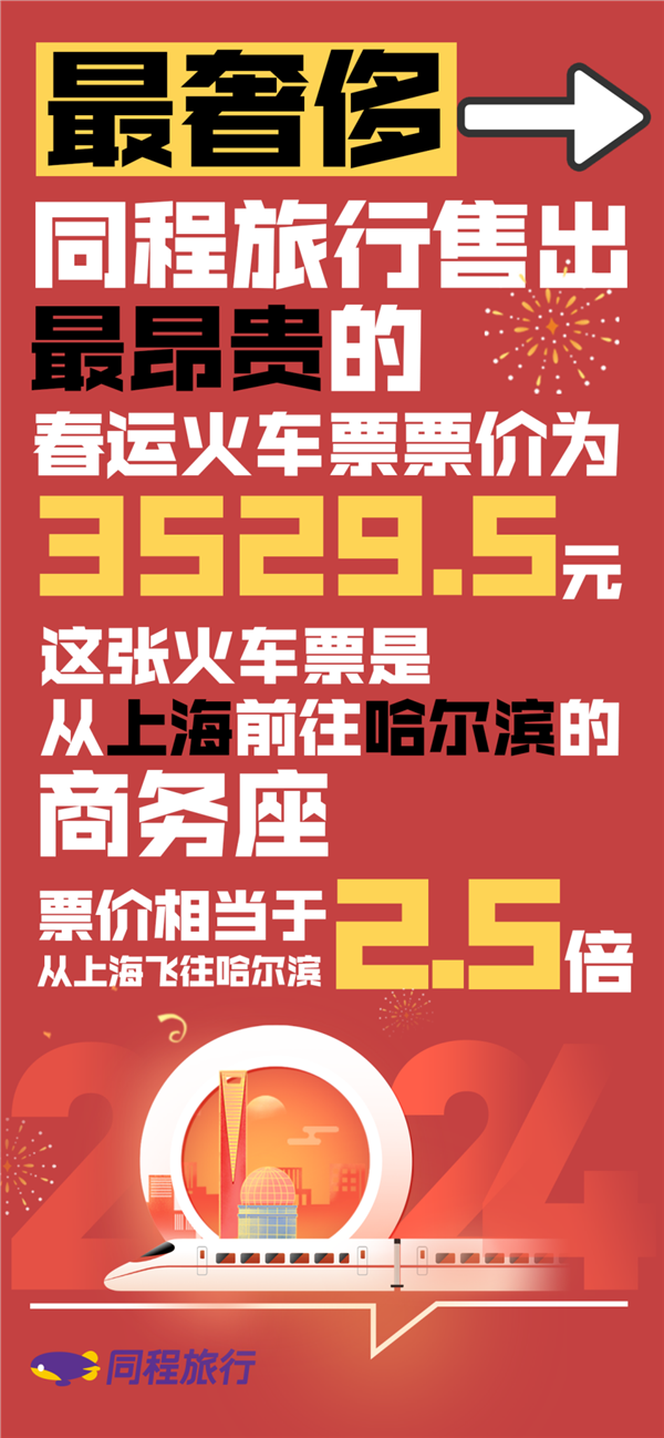 2024年春运期间,有一位旅客通过同程旅行平台预订了上海前往哈尔滨的高铁商务座,票价为3529.5元,相当于上海飞哈尔滨普通航班经济舱价格的2.5倍,是平台上春运期间客单价最高的火车票。可以享受舒适的乘车环境,又能在旅途中看到从南到北逐渐变化的自然风光,也是不一样的体验。 copyright dedecms