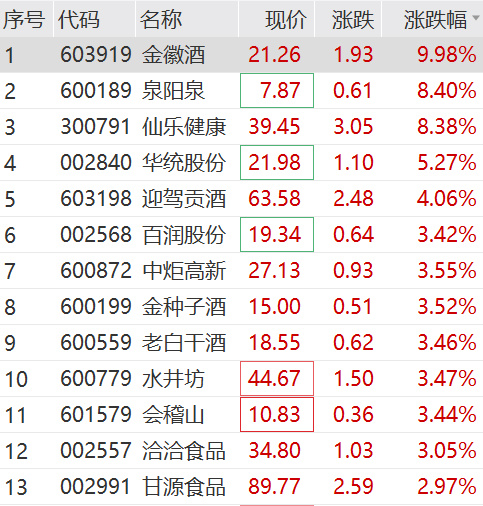 另外,上午食品饮料盘中走高,白酒股整体回暖。金徽酒绩后强势涨停封板,迎驾贡酒、金种子酒、水井坊、老白干酒等多股均有明显涨幅。 内容来自dedecms
