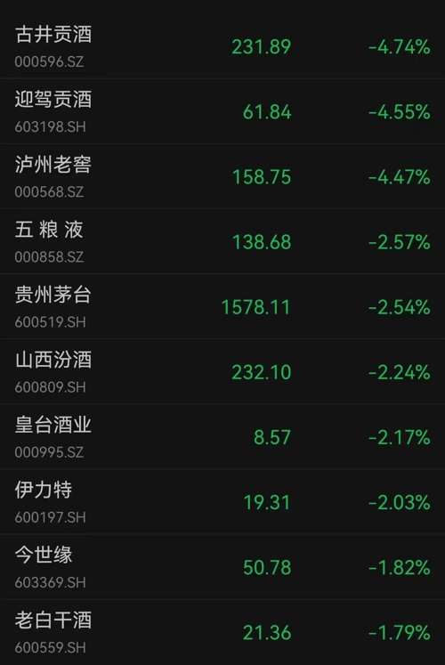6月11日早盘,A股白酒股持续走低,截至发稿,泸州老窖、古井贡酒盘中跌超4%,贵州茅台、山西汾酒、五粮液也跌超2%。