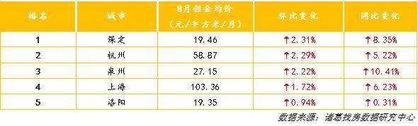 从环比上涨城市来看,8月租金环比上涨的TOP5城市为保定、杭州、泉州、上海、洛阳,环比分别上涨2.31%、2.29%、2.22%、1.72%、0.94%。 织梦好,好织梦