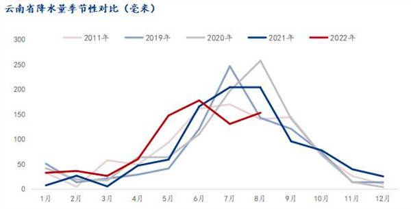 财联社记者从Mysteel了解到,云南省今年7月降水量同比少36%,8月份降水量同比减少24.6%,整体低于2011年干旱年份水平,造成云南主力水库同比去年的蓄能有所下降、主力电站来水偏枯。9月预计云南省主要流域来水较多年平均偏少10%-25%左右,而由于四季度已进入枯水期,降水量仅有三季度的12%-23%,即使降雨量有所增加也难以对整体蓄水情况有太大影响,预计今年乃至明年4月枯水期结束前云南电力供应情况都将非常紧张。