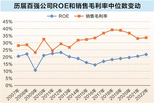 百强公司的销售毛利率为33.68%,较上年提升0.5个百分点,较沪深300中位数高出8个百分点。和主板公司相比,小而美的“双创”公司(创业板价值50强和科创板价值30强)体现出更强的赚钱能力,入围公司ROE中位数为21%,比整体水平高出12个百分点。值得注意的是,近两年上市公司面临经济发展“三重压力”和疫情反复等因素冲击,多数公司毛利率和杠杆水平有所下降,但净资产收益率仍保持稳定增长,反映出百强公司的综合实力。