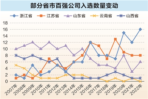 和2007年相比,云南入选公司数量从5家降至近年来仅有1家或2家入选,在资本市场的影响力日渐式微。2020年、2021年、2022年云南IPO公司数量分别为2家、2家和1家,上市公司总数仅有41家,在西部省市中处于中游水平。另一个资源大省山西入围百强的数量也从8家降至1-2家,近年来国内经济从规模优势向质量优势转变,传统煤炭行业上市公司增长乏力,战略新兴产业匮乏是其表现较弱的主要原因。 织梦内容管理系统