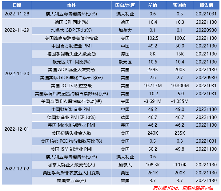 欧洲方面,欧洲央行副行长金多斯表示,欧元区经济很可能在今年四季度和明年第一季度出现收缩,通胀可能会在明年初开始放缓;欧元区11月Markit制造业PMI初值为47.3,连续五个月低于荣枯线,但好于预期的46,服务业PMI降至48.6,连续第四个月下滑,综合PMI初值则由10月的47.3升至47.8。国家层面,德国11月制造业PMI初值回升至46.7,高于预期的45,服务业PMI初值46.4,略好于预期,综合PMI录得46.4,仍位于荣枯线下方,不过是三个月来的最高水平;法国11月制造业PMI初值升至49.1,好于预期,服务业PMI初值录得49.4,为20个月以来新低,综合PMI初值录得48.8,为21个月以来新低;英国11月制造业PMI初值持平于46.2;服务业PMI初值为48.8;综合PMI初值为48.3,均好于预期。