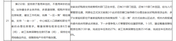 其中一项工作任务是:坚持房子是用来住的、不是用来炒的定位,加快健全多主体供给、多渠道保障、租购并举的住房制度,健全工作机制,完善“一区一策”调控措施,支持“一老一小”、中心城区人口疏解和职住平衡的合理住房需求。