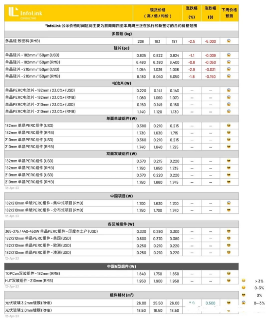 在N型电池片部分,本周价格随着PERC电池片价格维持没有变化,TOPCon(M10)电池片当前成交价格落在每瓦1.2-1.22元人民币。而HJT(G12)电池片由于主要订单来自海外,成交数尚少,落在每瓦1.3-1.4元人民币不等。近期可以观察到TOPCon电池片买卖双方不论厂家数量与成交量都在提升,预计五月出台TOPCon电池片公示价格。 copyright dedecms