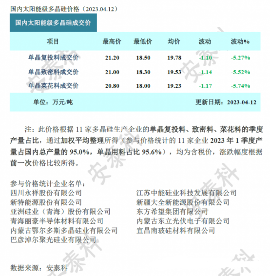 中国有色金属工业协会硅业分会数据显示,本周国内单晶复投料价格区间在18.5-21.2万元/吨,成交均价为19.78万元/吨,周环比降幅为5.27%;单晶致密料价格区间在18.3-21.0万元/吨,成交均价为19.53万元/吨,周环比降幅为5.52%。