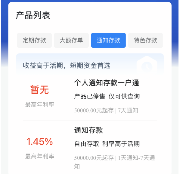 建设银行App显示,该行存款产品专区,通知存款列表下的“个人通知存款一户通”产品已停售,目前仅可供查询;下方的通知存款最高年化利率为1.45%,与工商银行保持一致,也是较央行基准利率均加点0.1个百分点。 copyright dedecms