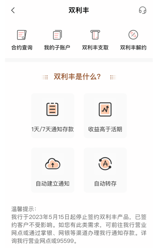 农业银行App显示,该行存款专区中的“双利丰”于5月15日起停止签约,已签约客户不受影响。“双利丰”即为该行的智能通知存款,可自动建立通知,自动转存。此前该行7天期通知存款最高年化利率可达1.75%。 copyright dedecms