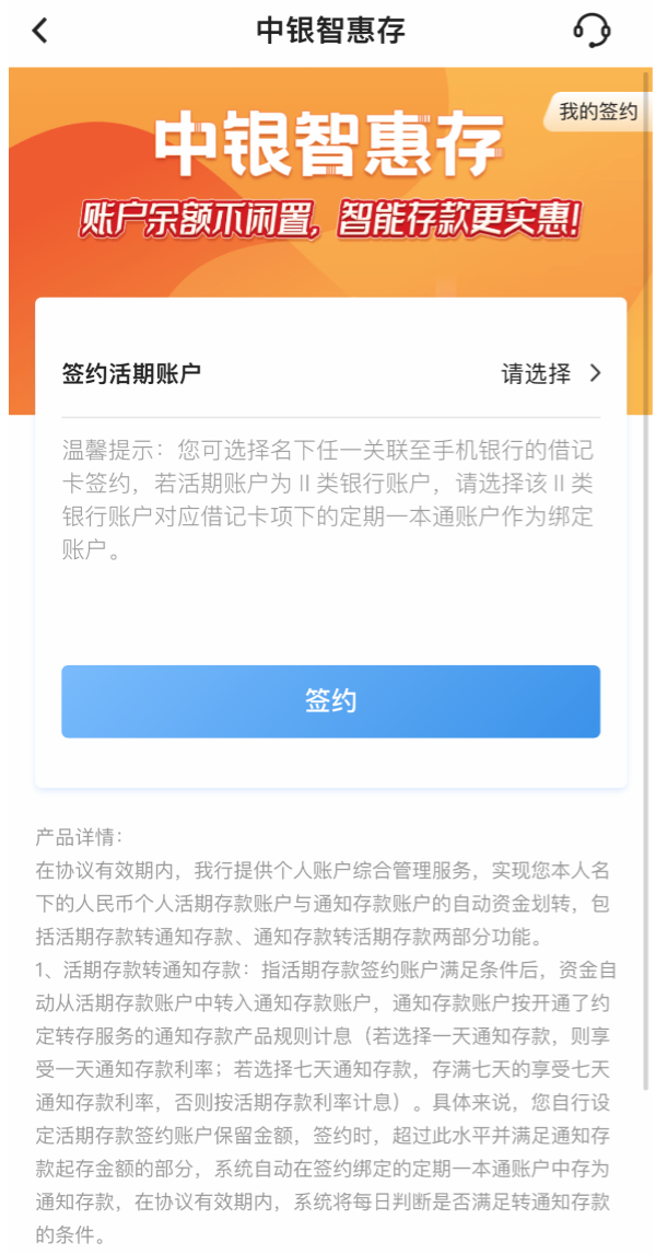 中国银行App显示,该行存款管理专区,“中银智慧存”即是智能通知存款产品。不过,截至目前该行未发布停止签约的提示信息。已签约的产品协议书显示,该产品利率为央行基准利率加0.5个百分点,在协议有效期内以7天为循环进行转存服务。 织梦好,好织梦