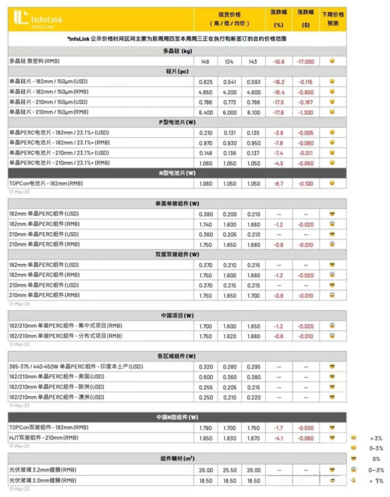 本周组件价格持续出现下调整,厂家确实开始让价,单玻组件执行价格区间约每瓦1.6-1.75元人民币、主流价格1.65-1.66元人民币,双玻主流价格约1.68-1.69元人民币。中后段厂家价格偏向低价区间,本周也可听闻1.6元的低价开始出现,价差分化仍十分明显,但近期也因成本因素影响部分厂家开始调整价格策略,二季度后续价格仍希望稳定缓跌为主。 内容来自dedecms