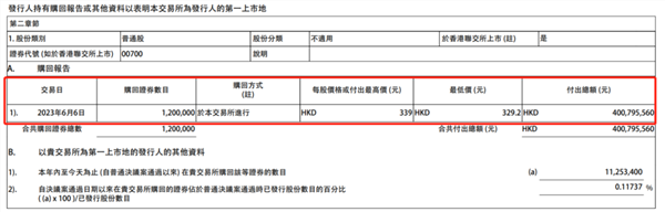 腾讯在港交所发布公告,当日耗资约4.01亿港元回购了120万股股份,每股成交价介于329.2港元至339港元之间。这已经是6月以来腾讯第4次回购,就在前一天,其耗资1.16亿港元回购了34.89万股。 copyright dedecms