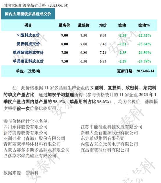 六月虽然出现个别硅料企业减产,甚至停产,但是由于硅料环节产能基数庞大、叠加新产能陆续释放,整体产量预计增至53.5-54.5GW/月,单月产出量环比继续增加。颗粒硅产能逐步增长,硅料环节现货库存继续堆高风险加剧,价格加速下滑速度加快。 copyright dedecms