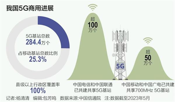 中国信通院副院长王志勤指出,我国已经建成全球技术最先进、规模最大的5G独立组网,截至2023年5月,我国5G基站总数已达284.4万个,占移动基站总数的25.3%,县城以上行政区覆盖率达100%,实现“县县通5G”。