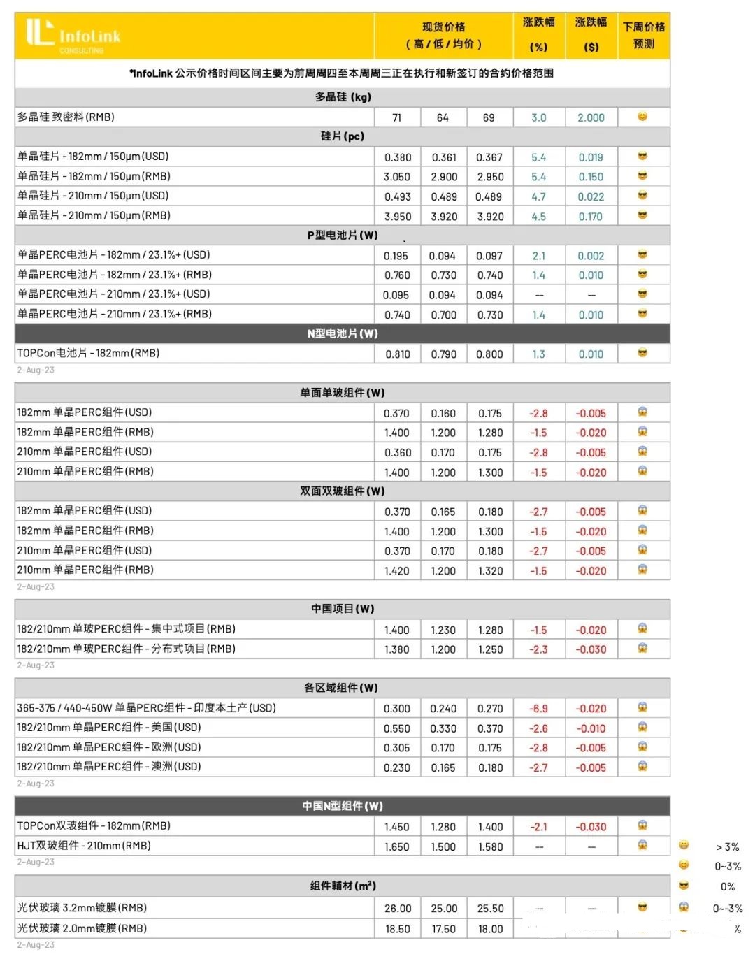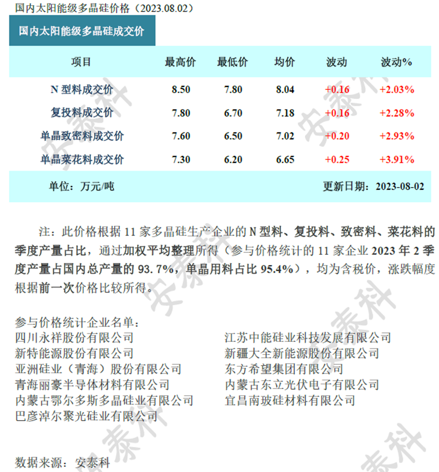 7月底硅片龙头厂家更新报价,M10尺寸新的报价上调到每片2.93-2.95元人民币之间,其余硅片厂家也随后陆续上调价格,本周主流成交价格出现上行,P型硅片中M10与G12尺寸落在每片2.95元与每片3.92元人民币左右,同比上周涨幅约4-6%不等。N型硅片部分,本周主流成交价格也对应上升到每片3.05元人民币。 dedecms.com