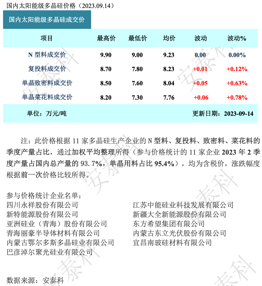 中国有色金属工业协会硅业分会数据显示,本周硅料市场价格小幅上涨,N型料价格区间在9-9.9万元/吨,成交均价为9.23万元/吨,周环比波动0%;复投料价格区间在7.8-8.7万元/吨,成交均价为8.23万元/吨,周环比涨幅为0.12%。单晶致密料成交价格7.6-8.5万元/吨,成交均价为8.04万元/吨,周环比涨幅为0.63%。单晶菜花料成交价格7.3-8.2万元/吨,成交均价为7.76万元/吨,周环比涨幅为0.78%。