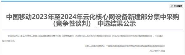 据中国移动采购与招标网消息,中国移动公示2023年至2024年云化核心网设备新建部分集采(竞争性谈判)的中选结果,华为技术有限公司联合体(华为技术有限公司及华为技服务有限公司)、中兴通讯股份有限公司中标。
