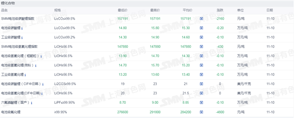 网络整理 2025-12-19 13:40证券之星新能源车行业周报:据上海有色网,截止11月10日,电池级碳酸锂14.8-15.8万元/吨,均价15.3万元/吨,环比上一工作日下滑0.2万元/吨;工业级碳酸锂14.3-14.9万元/吨,均价14.6万元/吨,环比上一工作日下滑0.1万元/吨。上游锂盐企业更多以长单出售为主,挺价心态依旧,但个别锂盐企业随行就市小幅下调出售价格,下游正极材料企业出于降本增效策略,其散单拿货情绪也依旧低迷,近期碳酸锂现货市场成交价格仍呈现下行趋势。