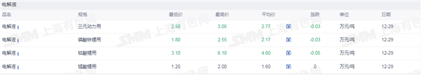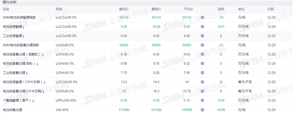网络整理 2025-12-20 03:07证券之星新能源车行业周报:据上海有色网,截止12月29日,电池级碳酸锂9.3-10.08万元/吨,均价9.69万元/吨,环比上一工作日下滑0.01万元/吨;工业级碳酸锂8.55-9.05万元/吨,均价8.80万元/吨,环比上一工作日持平。临近年末,市场成交依旧维持清淡局面。当前贸易商因近期期现货价差扩大,进行持续期现货套利,对锂盐端采买需求小幅增加,而部分盐厂在期货价格相对较高的情况下,交仓意愿亦有所增强,供应端挺价情绪渐浓,市场维持弱稳局面。