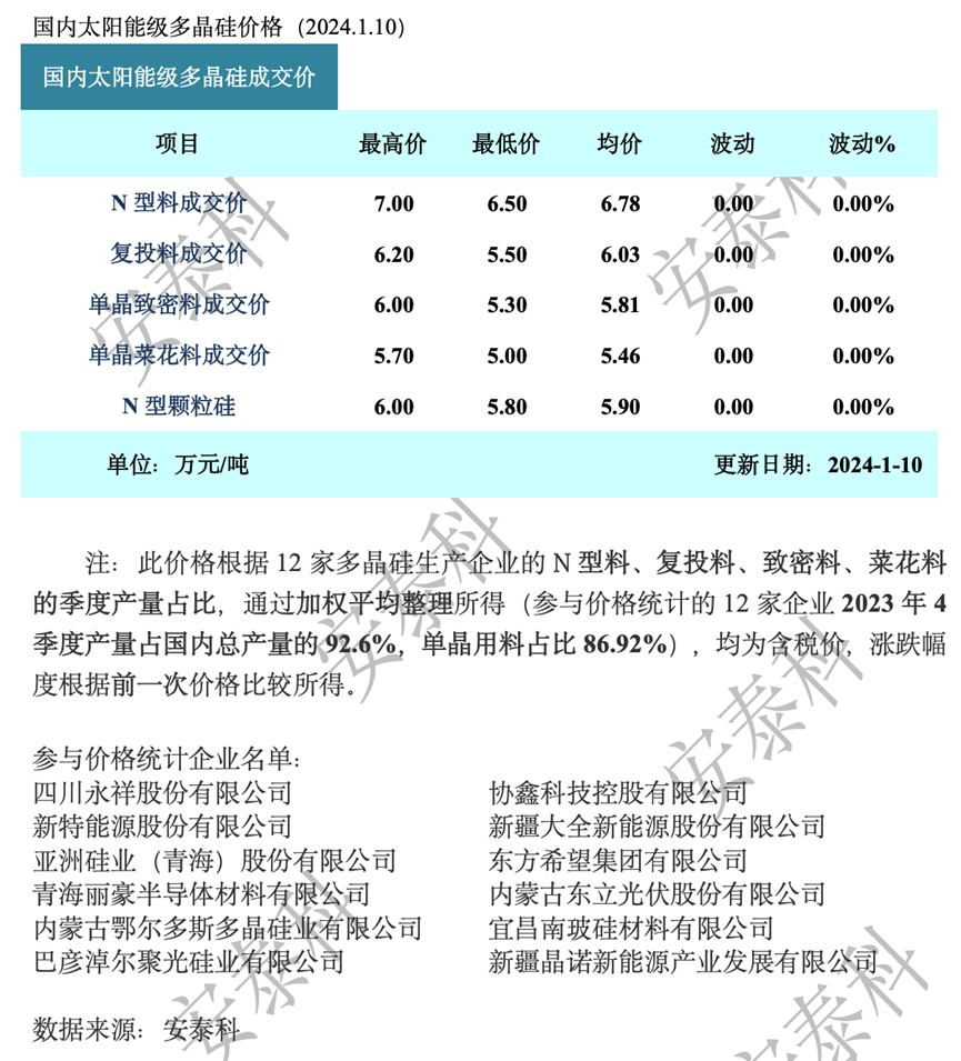 本周各品种价格暂稳,其中n型料低价有所下滑。本周n型硅料有6家企业成交,p型硅料有6家企业成交。截至本周,绝大多数企业已经签完1月订单,部分企业已签单至2月中下旬,近一周成交订单大部分为小单散单,还有部分非主流产品成交。