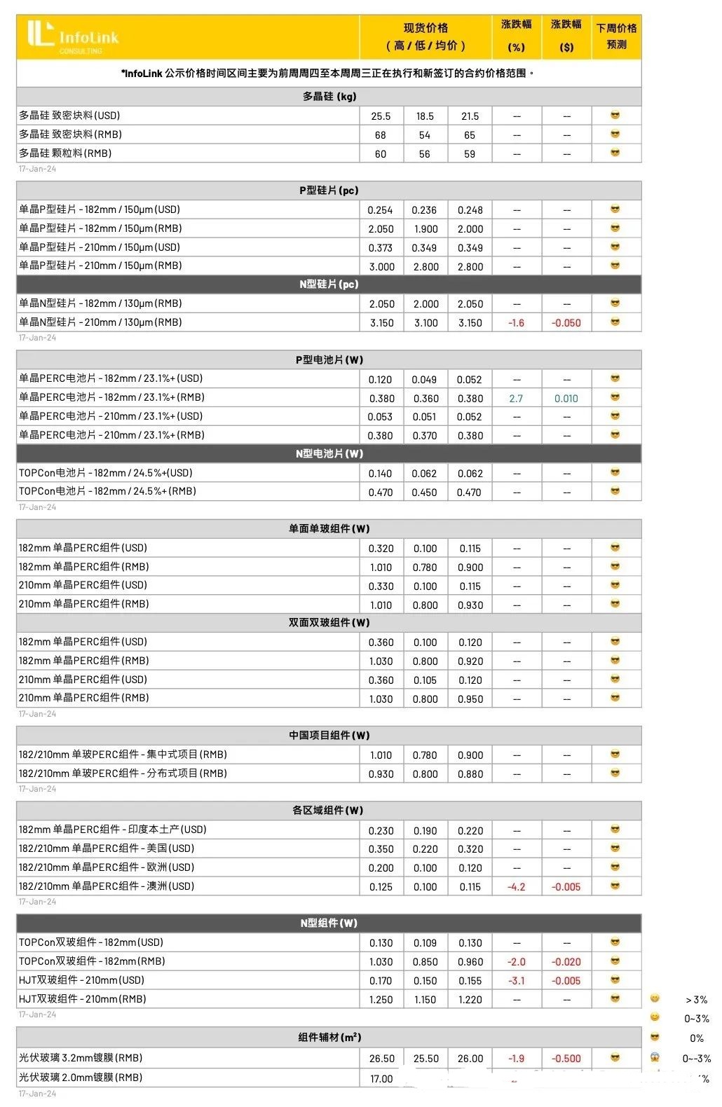 海外部分,当前主要热点在受红海事件影响欧洲区域的运费上升,折算运价约每瓦0.011-0.015欧元不等。欧洲区当前FOB价格与前期相似故现货表中并无呈现变动,主要变动在于受运价影响CIF/DDP/DAP条款价格调涨,因风险因素考量,欧洲签订DDP/DAP条款订单增加较多。2024年欧洲交付主要以TOPCon组件为主,折算FOB价格约0.105-0.11欧元,而分销部分TOPConFOB价格约0.115-0.125欧元,其中与PERC项目差距约0.005-0.01欧元,黑背板组件约1-2欧分的溢价空间。 copyright dedecms