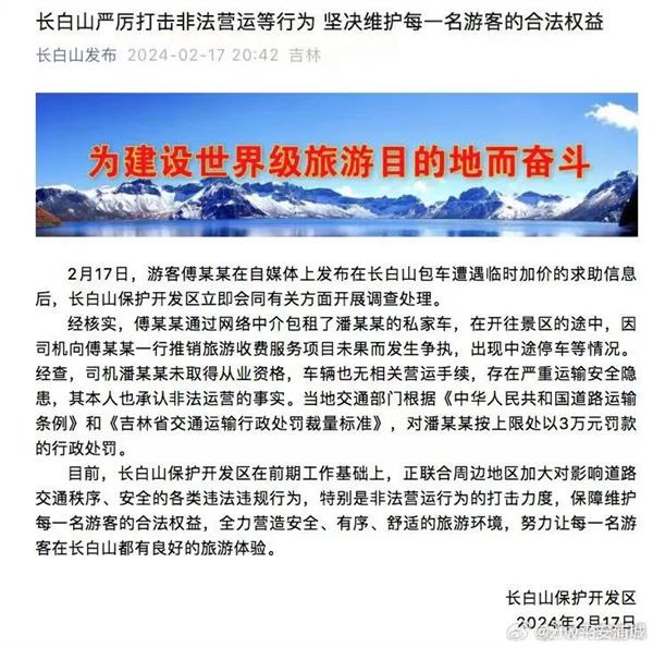 2月17日20时42分,“长白山发布”发布一则题为“长白山严厉打击非法营运等行为 坚决维护每一名游客的合法权益”的通告:2月17日,游客傅某某在自媒体上发布在长白山包车遭遇临时加价的求助信息后,长白山保护开发区立即会同有关方面开展调查处理。 copyright dedecms