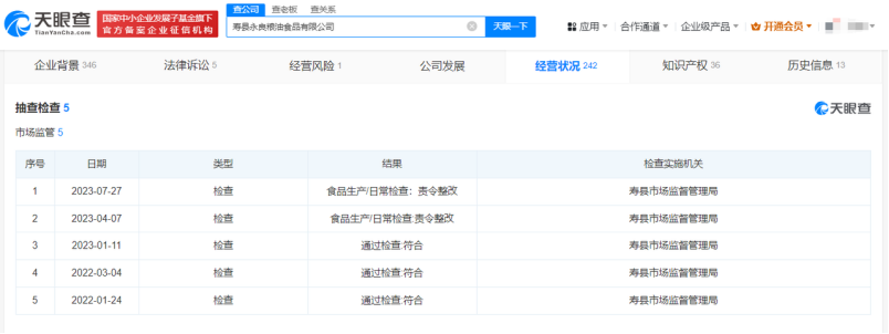 天眼查行政处罚信息显示,2023年4月13日,寿县永良粮油食品有限公司因虚假宣传被淮南市市场监督管理局罚款200万元。处罚事由显示,当事人为了获得市场竞争优势,提高大米销量,将寿县稻谷生产的大米宣称“二代泰国香米”,且以普通大米价格进行销售吸引消费者,使消费者将购买的寿县产大米与泰国产大米混淆,误认为购买的是泰国大米。抽查检查信息显示,寿县市场监督管理局分别在2023年4月、7月对寿县永良粮油食品有限公司进行2次抽查检查,结果均为“责令整改”。 内容来自dedecms