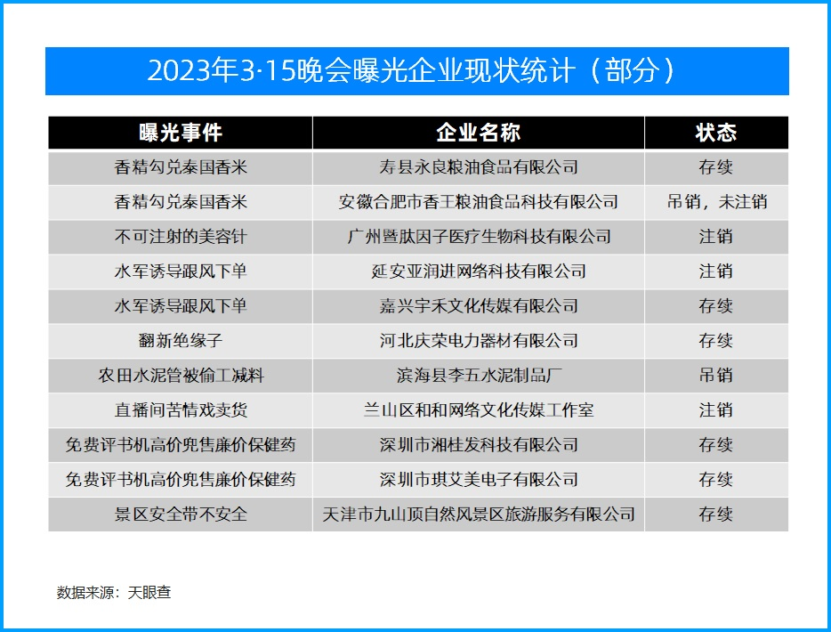 3·15晚会曝光的乱象企业今何在?有的被吊销注销,有的“吃”百万元罚单