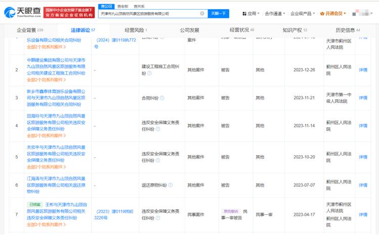 此外,因景区安全带风险隐患而被曝光的天津市九山顶自然风景区,天眼查法律诉讼信息显示,2023年以来,相关公司多次因“违反安全保障义务责任”成为司法案件被告。 本文来自织梦