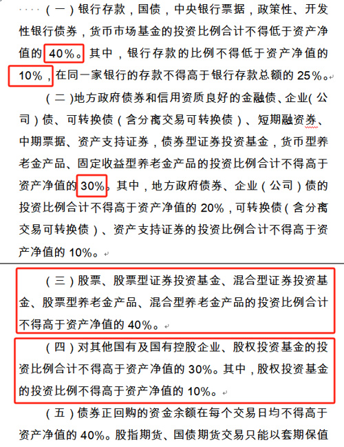 其中,除对划转企业及其控股企业增资外,中央层面和全国社会保障基金理事会受托管理的地方层面现金收益投资比例,权益类资产合计投资比例最高为40%;对其他国有及国有控股企业、股权投资基金的投资比例合计不得高于资产净值的30%。其中,股权投资基金的投资比例不得高于资产净值的10%。