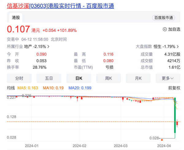 值得注意的是,信基沙溪曾在前天出现闪崩走势,当天收盘暴跌75.69%。