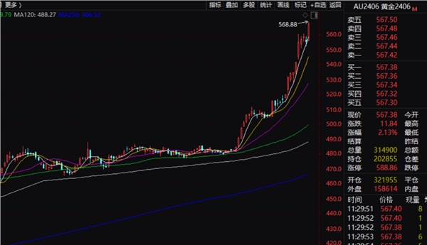 期货市场方面,上海期货交易所黄金期货主力合约报价最高达到568.88元/克。 织梦内容管理系统