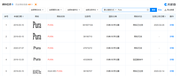 实际上,华为将P系列更名为Pura可能是“早有准备”。记者在天眼查网站中查询华为技术有限公司的知识产权信息发现,“PURA”和“HUA WEI PURA”商标已于2019年5月15日申请注册,分类为“科学仪器”,商标状态为“已注册”,注册公告时间分别为2020年4月28日和2020年2月14日。 copyright dedecms