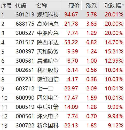 个股方面,观想科技、高凌信息双双走出20CM涨停,利君股份、奥维通信、七一二、四创电子、中兵红箭等多股涨停。 织梦内容管理系统