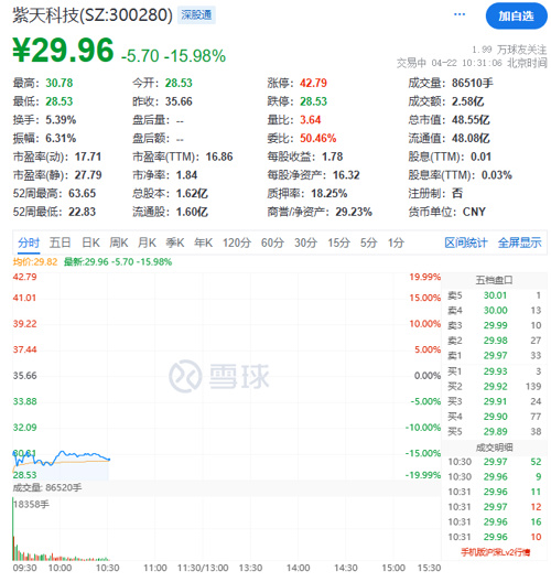 4月22日,紫天科技早间开盘触及跌停,股价低至28.53元/股,跌幅为19.99%。截至发稿,紫天科技跌幅近16%。 本文来自织梦