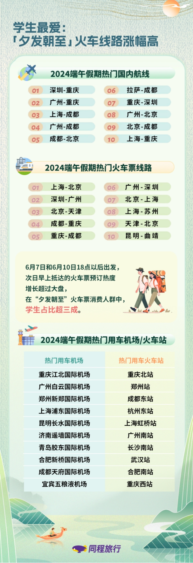 端午假期,为了高效利用3天假期,不少学生群体选择乘坐“夕发朝至”的火车,晚上赶路,白天游玩。同程旅行数据显示,6月7日和6月10日18点以后出发,次日早上抵达的火车票预订热度增长超过大盘,在“夕发朝至”火车票消费人群中,学生占比超三成。火车票热门线路则主要集中在京沪、广深、成渝、京津等核心城市之间。此外,节前山东前往拉萨的“铁腚大巴”走红网络,不少年轻游客也挖掘了更多“铁腚线路”,在端午假期出门体验。 copyright dedecms