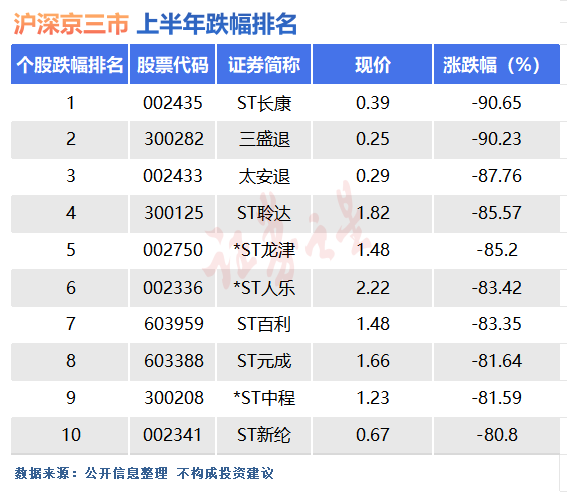 上半年的A股市场ST跌幅榜单中,ST股长康、三盛退、太安退等个股赫然在列,成为市场关注的焦点。其中,ST股长康(002435.SZ)以高达90.65%的跌幅,不幸成为上半年跌幅最大的个股,并因连续34个一字跌停而锁定退市。 内容来自dedecms