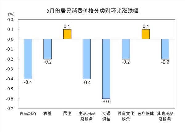 6月份,全国居民消费价格环比下降0.2%。其中,城市下降0.2%,农村下降0.2%;食品价格下降0.6%,非食品价格下降0.2%;消费品价格下降0.4%,服务价格持平。 内容来自dedecms