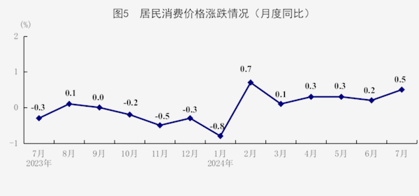 7月份,全国居民消费价格(CPI)同比上涨0.5%,涨幅比上月扩大0.3个百分点;环比上涨0.5%。分类别看,食品烟酒价格同比上涨0.2%,衣着价格上涨1.5%,居住价格上涨0.1%,生活用品及服务价格上涨0.7%,交通通信价格下降0.6%,教育文化娱乐价格上涨1.7%,医疗保健价格上涨1.4%,其他用品及服务价格上涨4.0%。在食品烟酒价格中,鲜果价格下降4.2%,粮食价格上涨0.1%,鲜菜价格上涨3.3%,猪肉价格上涨20.4%。扣除食品和能源价格后的核心CPI同比上涨0.4%。1-7月份,全国居民消费价格同比上涨0.2%。 dedecms.com