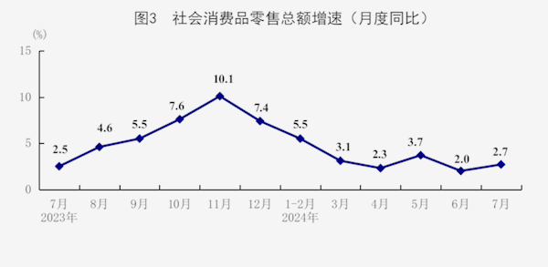 7月份,社会消费品零售总额37757亿元,同比增长2.7%,比上月加快0.7个百分点;环比增长0.35%。按经营单位所在地分,城镇消费品零售额32691亿元,同比增长2.4%;乡村消费品零售额5066亿元,增长4.6%。按消费类型分,商品零售额33354亿元,增长2.7%;餐饮收入4403亿元,增长3.0%。基本生活类商品销售较好,限额以上单位粮油、食品类,饮料类商品零售额分别增长9.9%、6.1%。部分升级类商品销售增长较快,限额以上单位通讯器材类,体育、娱乐用品类商品零售额分别增长12.7%、10.7%。1-7月份,社会消费品零售总额273726亿元,同比增长3.5%。全国网上零售额83784亿元,同比增长9.5%。其中,实物商品网上零售额70093亿元,增长8.7%,占社会消费品零售总额的比重为25.6%。1-7月份,服务零售额同比增长7.2%。 织梦内容管理系统
