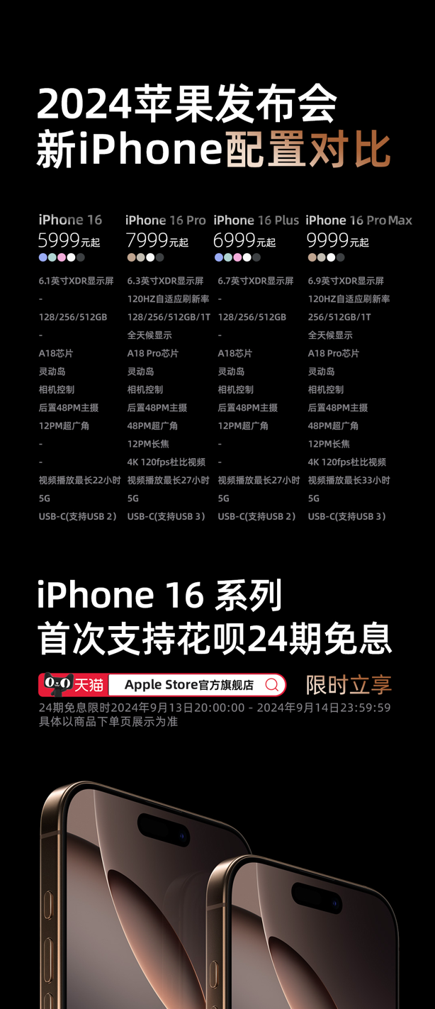 网络整理 2025-12-23 15:59今日,苹果最新iPhone16系列发布。该系列四款机型将于9月13日20时起,在苹果天猫期舰店首发预售,预售前28小时,支持花呗24期分期免息购买。这是苹果首次在发新期间支持花呗24期分期免息。以基础128G款iPhone16为例,消费者使用花呗24期分期免息购买,每个月仅需支付约250元。