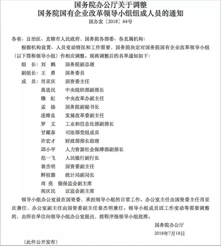 中国政府网7月26日发布《国务院办公厅关于调整国务院国有企业改革领导小组组成人员的通知》。国务院副总理刘鹤任国务院国有企业改革领导小组组长,国务委员王勇任副组长,国资委主任肖亚庆等14人为小组成员。 内容来自dedecms