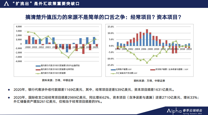 比方说去年,如果从外汇局公布的银行代客跨境收付的数据来看,确确实实顺差1169亿美元,但是经常账户是逆差539亿,资本账户顺差1631亿。如果从口径来看,显然去年人民币升值的压力应该是来自于资本项目,或者说是来自于热钱流入。