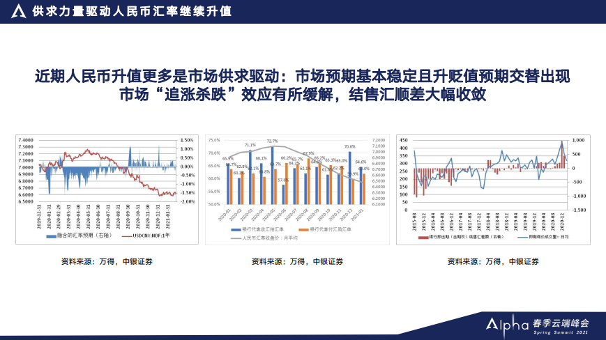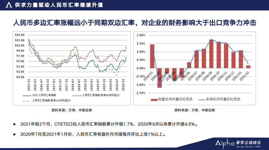 在18、19年中央经济会议的公告中,都没有提保持人民币汇率在均衡合理水平上的基本稳定,但是2020年,就是去年年底的中央经济工作会议重提保持人民币汇率在合理均衡水平上的基本稳定。一个很重要的原因是人民币从去年6月份开始又出现持续的单边升值。所以到目前为止对中国出口竞争力的影响是有限的,但是持续的单边升值会对企业财务上带来一定的压力。这也是为什么时隔两年以后,中央经济工作会议公告再提汇率维稳目标的一个重要的考虑。